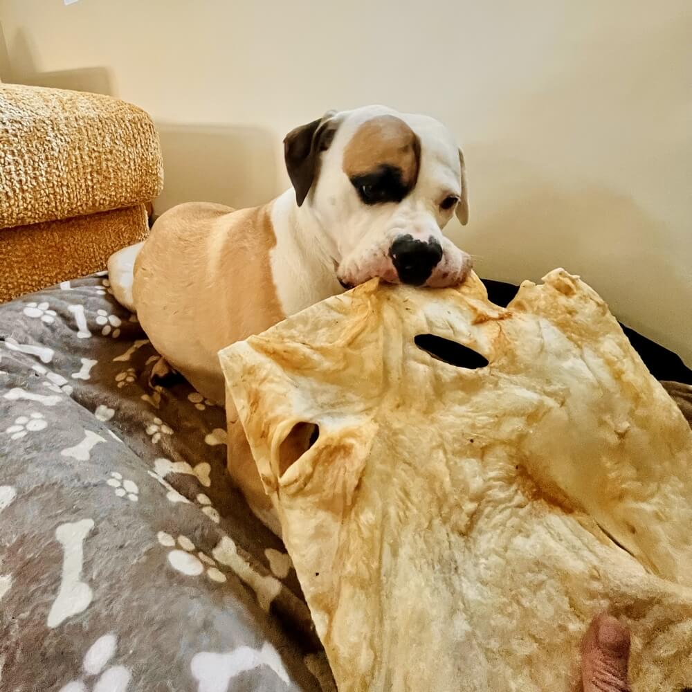 Onze Labrador Retriever vindt zijn nieuwe favoriete snack runderkophuid platen XL erg lekker. Ze zijn echt mega groot en onze Bob vindt het heerlijk om er op te knagen!
