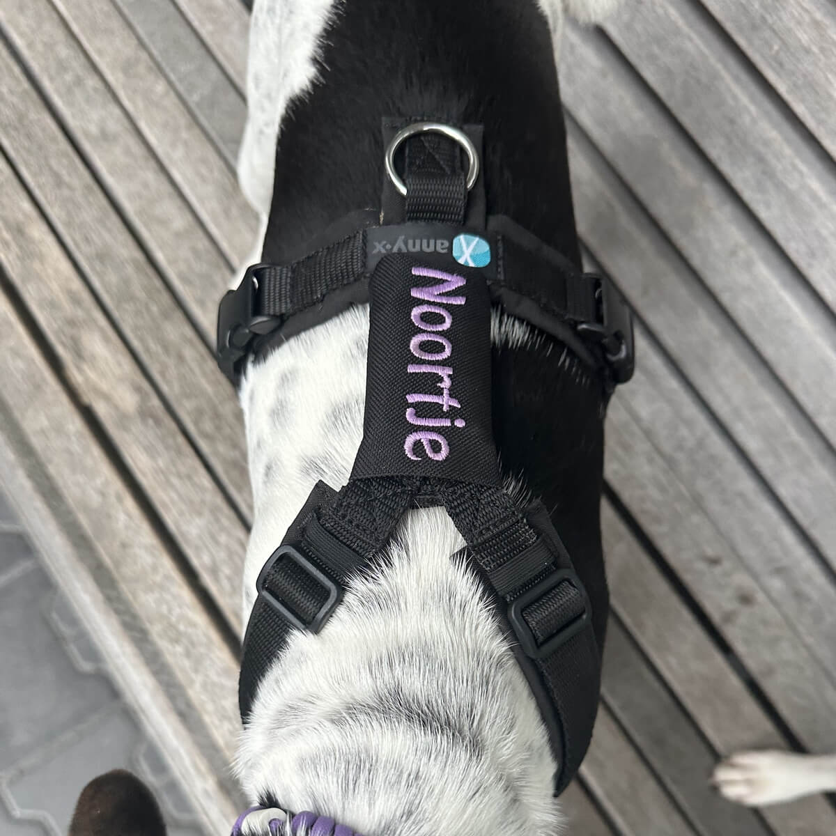 Naamtag aan de zijkant bij buik (bij een AnnyX tuigje maat M, L of XL past dit goed)