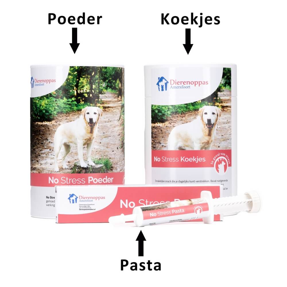 - Je kunt indien gewenst de No Stress Pasta, Koekjes en Poeder samen geven. Bijvoorbeeld eerst de poeder in de weken voorafgaand een stressvolle situatie (zoals Oud & Nieuw). En dan op de dag zelf (of 2-3 dagen van tevoren + de dag zelf) de No Stress Pasta of Koekjes.