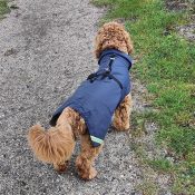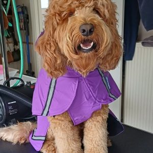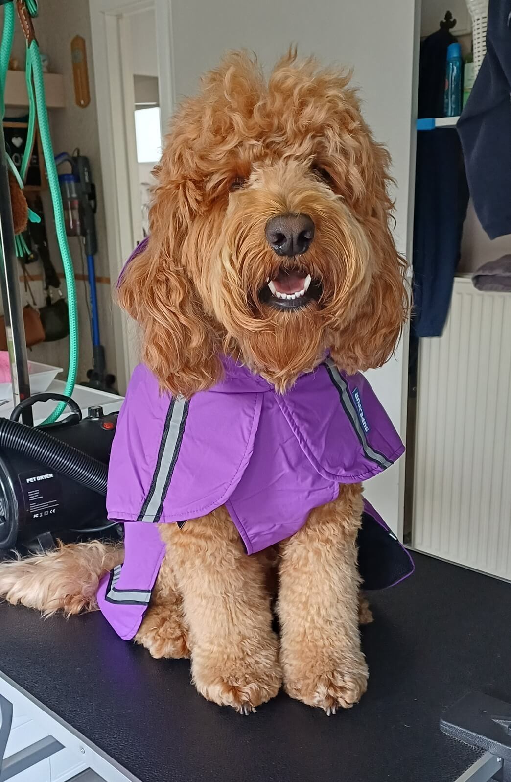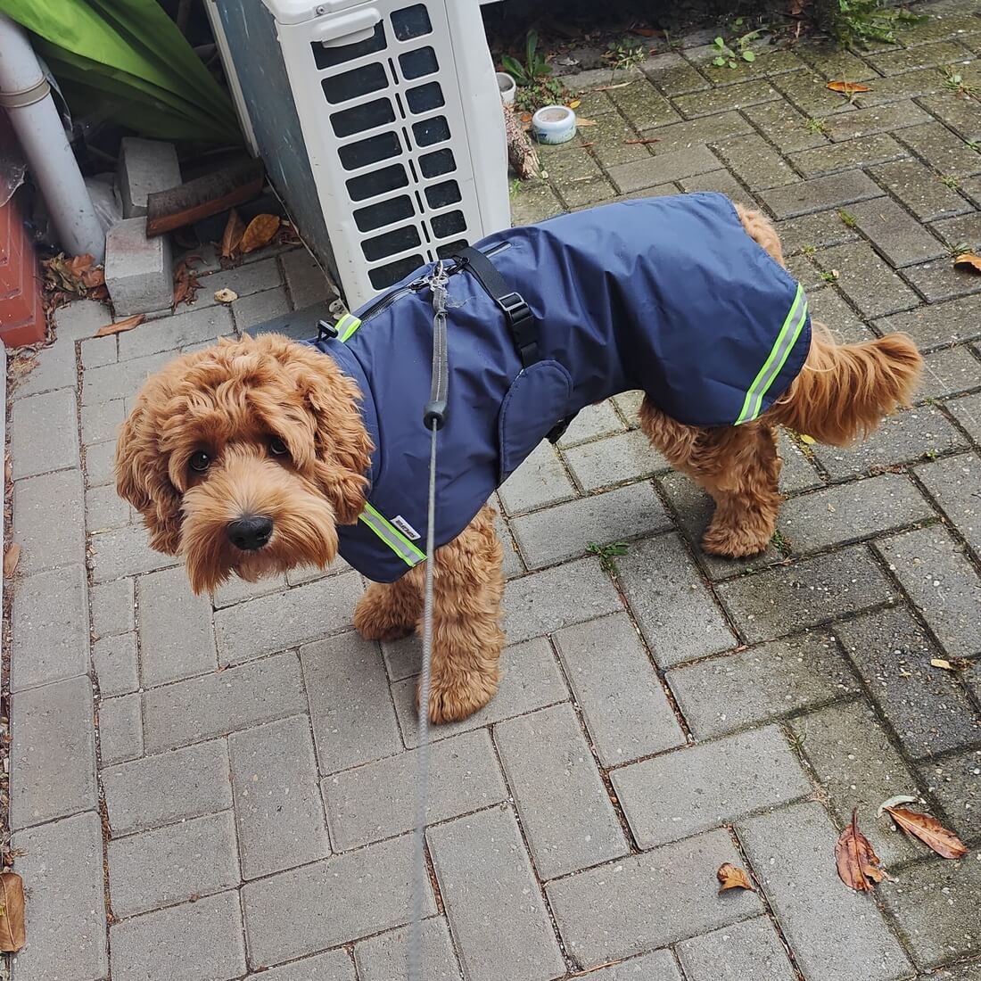 Labradoodle van 17kg met een ruglengte van 50cm draagt de Stormy regenjas maat XS.