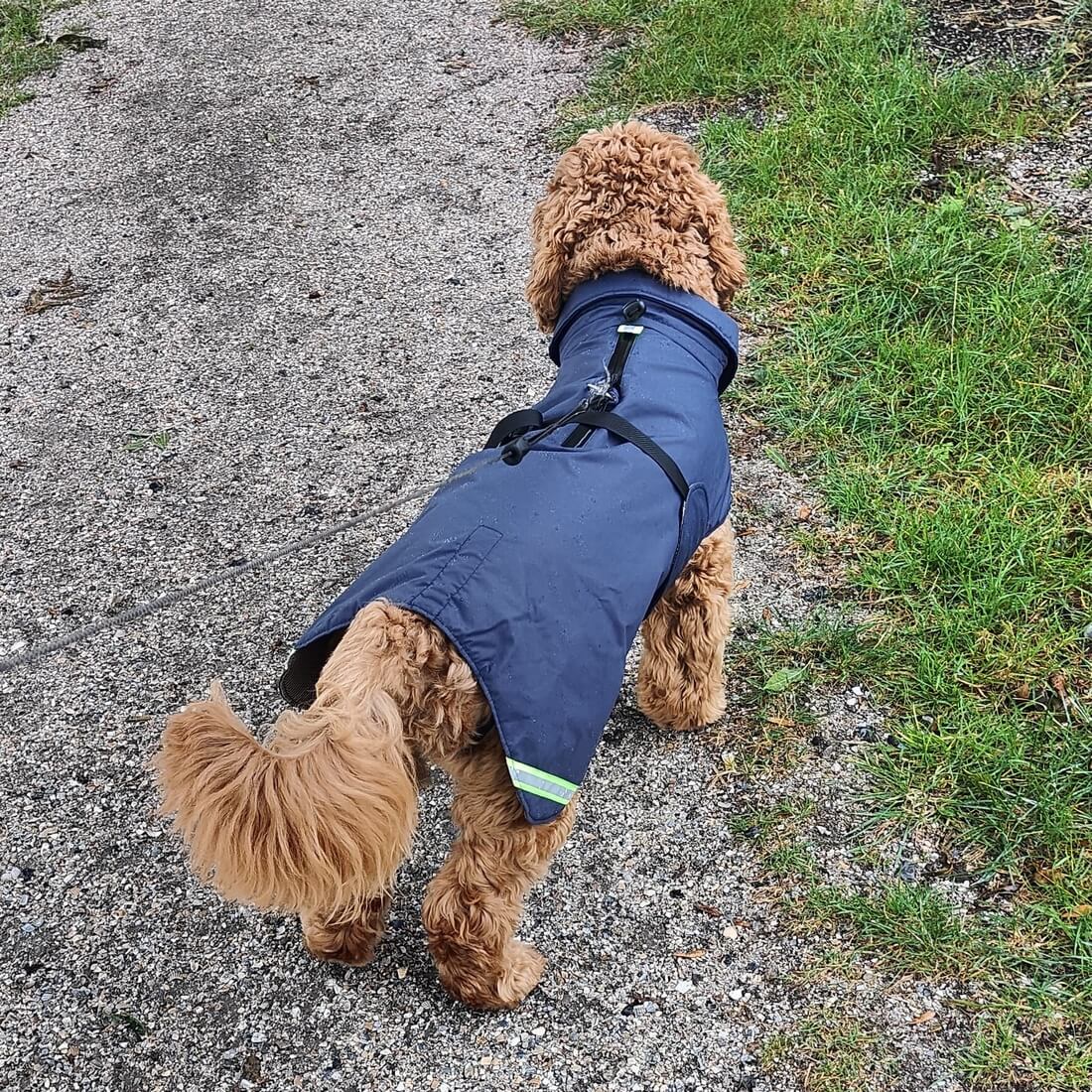 Onze honden regenjassen zijn geschikt en lekker warm voor in de koude lente, koude herfst en winter. Onze stormy jassen zijn niet waterdicht, maar uiteraard wel waterafstotend (waterkolom 10.000) en winddicht. Dit is belangrijk voor een hondenregenjas. Houd er rekening mee dat waterafstotend niet hetzelfde is als waterdicht. De jassen zijn voorzien van een waterafstotende buitenlaag. Dit houdt in dat regendruppels er vanaf rollen bij regen. Regent het het hard of wordt er druk uitgeoefend op de stof, dan zal de stof langzaam water opzuigen (dit is net zo bij regen- en winterjassen voor mensen, alles hangt af van de waterkolom en waterdruk). De stormy regenjas komt het meest in de buurt van waterdicht, door de hoge waterkolom.