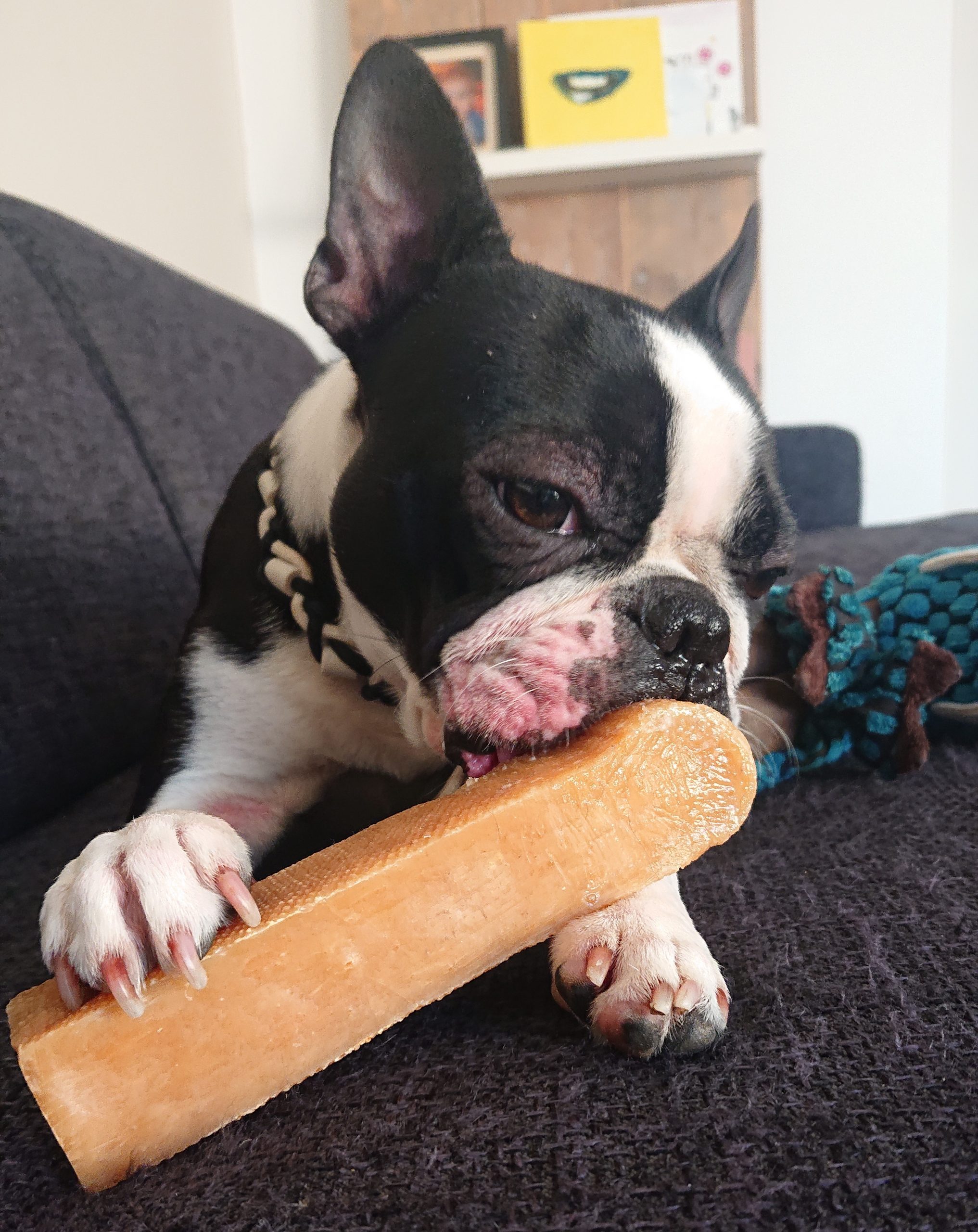 Joy (15 weken) knaagt er heerlijk aan. Van tevoren wel ff om advies gevraagd en deze opgevolgd. Zojuist nog een yakkaas besteld om als ‘voorraad’ te hebben.
