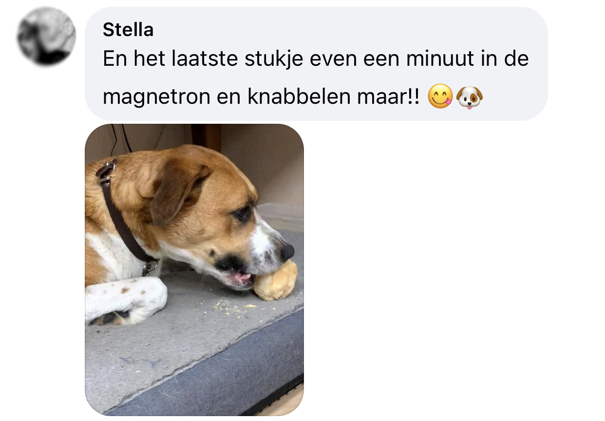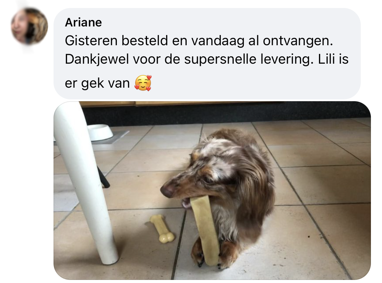 - Linda van Noort: “Ons Toy poedeltje is gisteravond de hele tijd zoet geweest met het yak bot. Echt fantastisch! Toen hij hem net kreeg was hij er heel voorzichtig mee en dacht eerst dat het een speeltje was. Hij liet hem ook aan iedereen zien. Na een uur begon hij toch lekker te kluiven.”