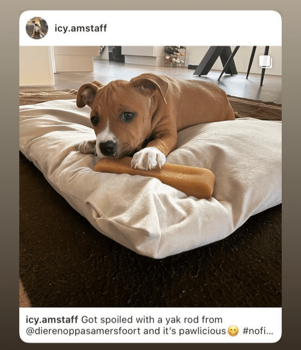 - J Wijnmalen: “Milka en ik zijn super blij met de yakstaaf! Milka heeft een kippeneiwit allergie, waardoor ze veel snoepjes en kauwstaven niet mag. De yakstaaf viel vanaf de eerste seconde al in de smaak!“